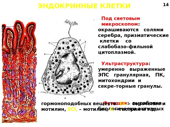 ЭНДОКРИННЫЕ КЛЕТКИ Под световым микроскопом : окрашиваются солями серебра, призматические клетки со слабобазо-фильной цитоплазмой. Ультраструктура : умеренно выраженные ЭПС гранулярная, ПК, митохондрии и секре-торные гранулы. Функция : выработка биологически активныхгормоноподобных веществ: ЕС – серотонин и мотилин, ECL – мотилин, G – гастрин и т. д.