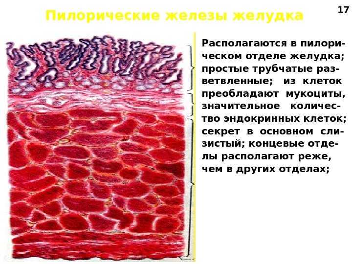 Пилорические железы желудка Располагаются в пилори- ческом отделе желудка; простые трубчатые раз- ветвленные; из клеток преобладают мукоциты, значительное количес- тво эндокринных клеток; секрет в основном сли- зистый; концевые отде- лы располагают реже, чем в других отделах;