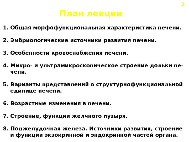 План лекции 1. Общая морфофункциональная характеристика печени. 2. Эмбриологические источники развития печени. 3. Особенности кровоснабжения печени. 4. Микро- и ультрамикроскопическое строение дольки пе- чени. 5. Варианты представлений о структурнофункциональной единице печени. 6. Возрастные изменения в печени. 7. Строение, функции желчного пузыря. 8. Поджелудочная железа. Источники развития, строение и функции экзокринной и эндокринной частей органа.
