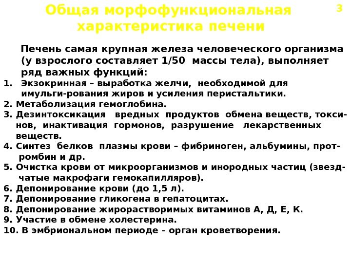 Общая морфофункциональная характеристика печени Печень самая крупная железа человеческого организма (у взрослого составляет 1/50 массы тела), выполняет ряд важных функций: 1. Экзокринная – выработка желчи, необходимой для имульги-рования жиров и усиления перистальтики. 2. Метаболизация гемоглобина. 3. Дезинтоксикация вредных продуктов обмена веществ, токси- нов, инактивация гормонов, разрушение лекарственных веществ. 4. Синтез белков плазмы крови – фибриноген, альбумины, прот- ромбин и др. 5. Очистка крови от микроорганизмов и инородных частиц (звезд- чатые макрофаги гемокапилляров). 6. Депонирование крови (до 1, 5 л). 7. Депонирование гликогена в гепатоцитах. 8. Депонирование жирорастворимых витаминов А, Д, Е, К. 9. Участие в обмене холестерина. 10. В эмбриональном периоде – орган кроветворения.