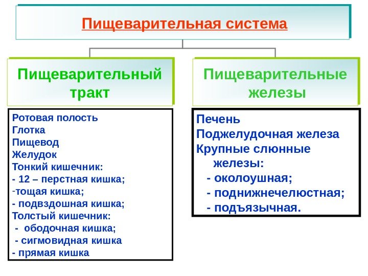 Пищеварительная система Пищеварительный тракт Пищеварительные железы Ротовая полость Глотка Пищевод Желудок Тонкий кишечник: — 12 – перстная кишка; — тощая кишка; — подвздошная кишка; Толстый кишечник: — ободочная кишка; — сигмовидная кишка — прямая кишка Печень Поджелудочная железа Крупные слюнные железы: — околоушная; — поднижнечелюстная; — подъязычная.