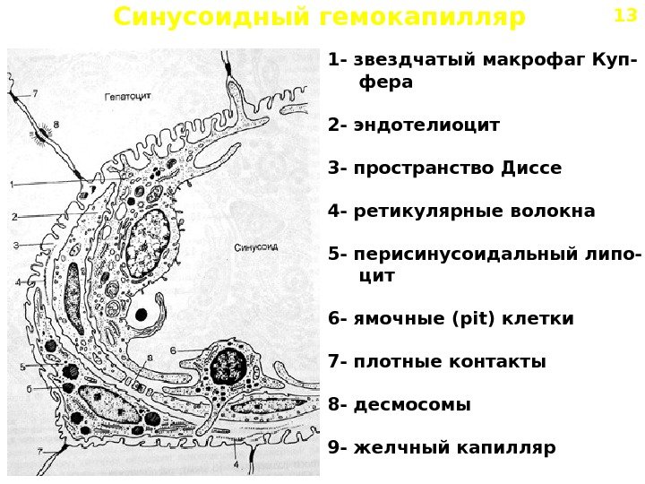 Синусоидный гемокапилляр 1 — звездчатый макрофаг Куп- фера 2 — эндотелиоцит 3 — пространство Диссе 4 — ретикулярные волокна 5 — перисинусоидальный липо- цит 6 — ямочные ( pit) клетки 7 — плотные контакты 8 — десмосомы 9 — желчный капилляр