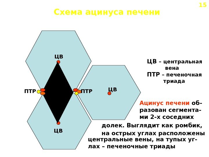 Схема ацинуса печени ПТР ЦВ ЦВ – центральная вена ПТР – печеночная триада ПТР Ацинус печени об- разован сегмента- ми 2 -х соседних долек. Выглядит как ромбик, на острых углах расположены центральные вены, на тупых уг- лах – печеночные триады