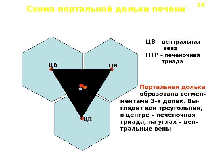 Схема портальной дольки печени ПТРЦВ ЦВ – центральная вена ПТР – печеночная триада Портальная долька образована сегмен- ментами 3 -х долек. Вы- глядит как треугольник, в центре – печеночная триада, на углах – цен- тральные вены