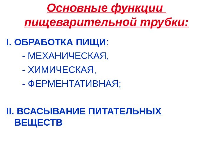 Основные функции пищеварительной трубки: I. ОБРАБОТКА ПИЩИ : — МЕХАНИЧЕСКАЯ, — ХИМИЧЕСКАЯ, — ФЕРМЕНТАТИВНАЯ; II. ВСАСЫВАНИЕ ПИТАТЕЛЬНЫХ ВЕЩЕСТВ