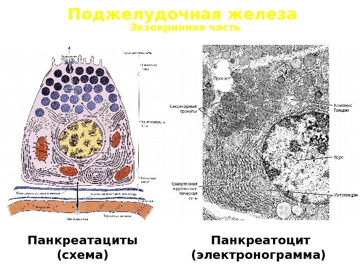Поджелудочная железа 3 1 2 Экзокринная часть Панкреатациты (схема) Панкреатоцит (электронограмма)