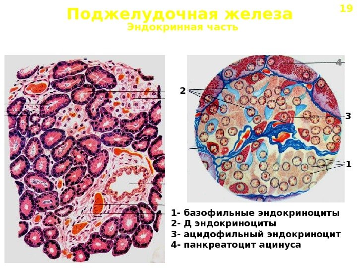 Поджелудочная железа Эндокринная часть 12 4 3 1 — базофильные эндокриноциты 2 — Д эндокриноциты 3 — ацидофильный эндокриноцит 4 — панкреатоцит ацинуса