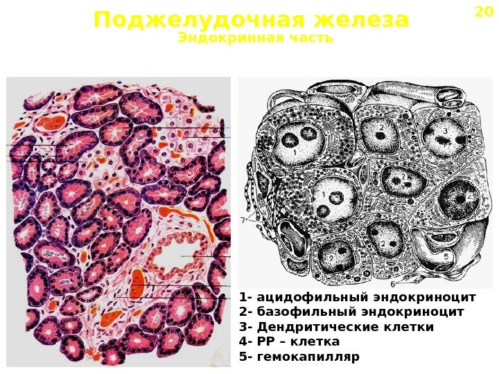 Поджелудочная железа Эндокринная часть 1 — ацидофильный эндокриноцит 2 — базофильный эндокриноцит 3 — Дендритические клетки 4 — РР – клетка 5 — гемокапилляр