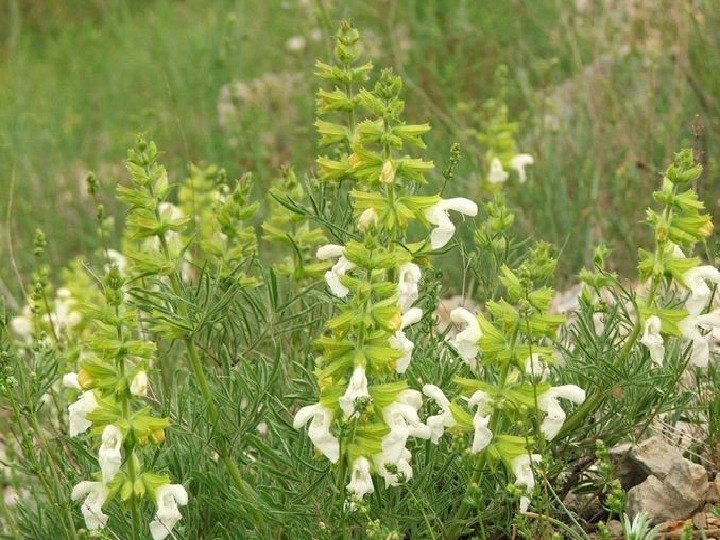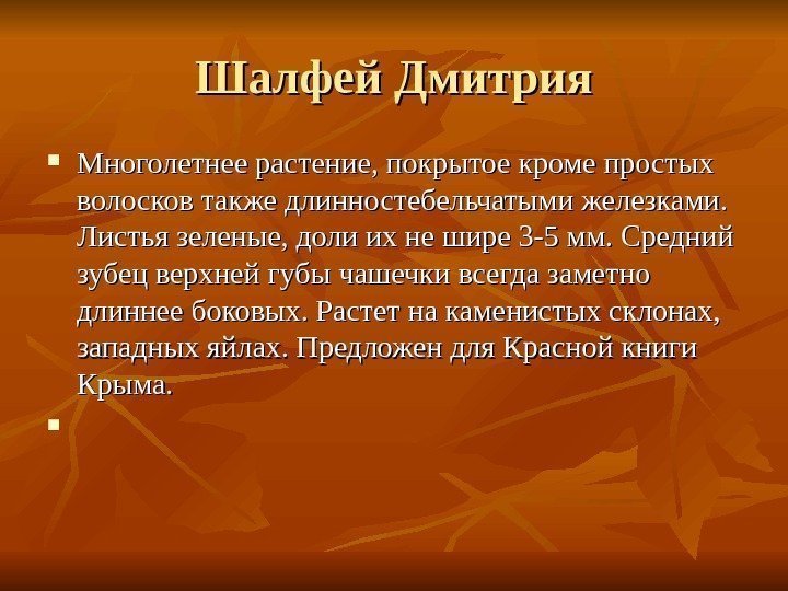 Шалфей Дмитрия Многолетнее растение, покрытое кроме простых волосков также длинностебельчатыми железками. Листья зеленые, доли их не шире 3 -5 мм. Средний зубец верхней губы чашечки всегда заметно длиннее боковых. Растет на каменистых склонах, западных яйлах. Предложен для Красной книги Крыма.