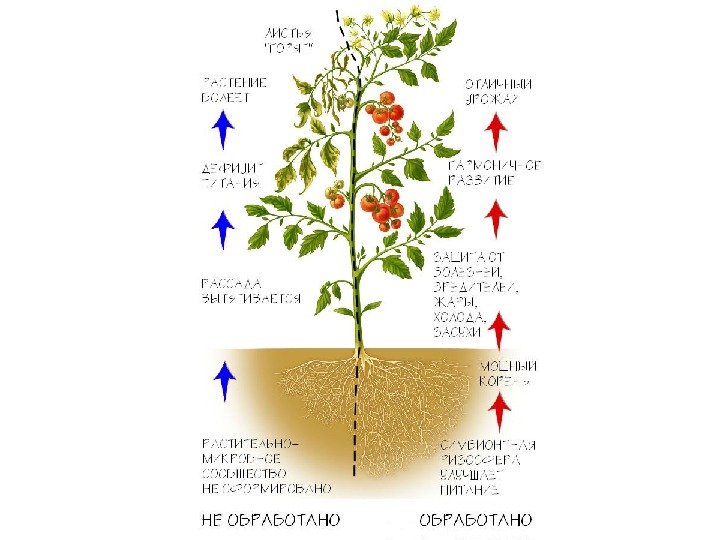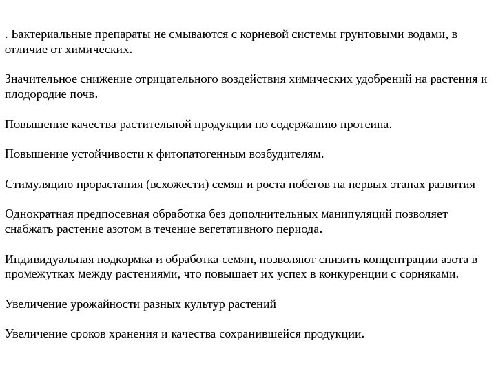 . Бактериальные препараты не смываются с корневой системы грунтовыми водами, в отличие от химических. Значительное снижение отрицательного воздействия химических удобрений на растения и плодородие почв. Повышение качества растительной продукции по содержанию протеина. Повышение устойчивости к фитопатогенным возбудителям. Стимуляцию прорастания (всхожести) семян и роста побегов на первых этапах развития Однократная предпосевная обработка без дополнительных манипуляций позволяет снабжать растение азотом в течение вегетативного периода. Индивидуальная подкормка и обработка семян, позволяют снизить концентрации азота в промежутках между растениями, что повышает их успех в конкуренции с сорняками. Увеличение урожайности разных культур растений Увеличение сроков хранения и качества сохранившейся продукции.
