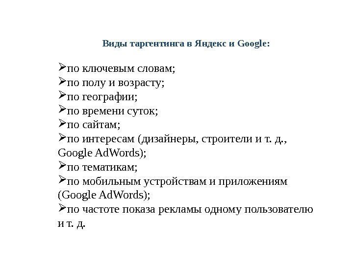 Виды таргентинга в Яндекс и Google: по ключевым словам; по полу и возрасту; по географии; по времени суток; по сайтам; по интересам (дизайнеры, строители и т. д. , Google Ad. Words); по тематикам; по мобильным устройствам и приложениям (Google Ad. Words); по частоте показа рекламы одному пользователю и т. д.