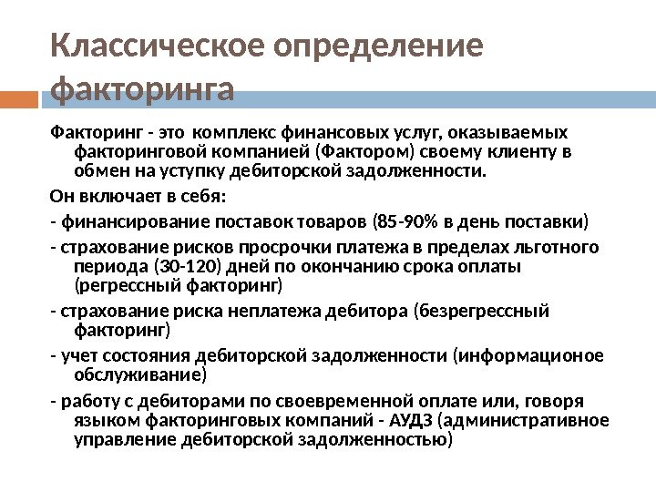 Классическое определение факторинга Факторинг — это комплекс финансовых услуг, оказываемых факторинговой компанией (Фактором) своему клиенту в обмен на уступку дебиторской задолженности. Он включает в себя: — финансирование поставок товаров (85 -90% в день поставки) — страхование рисков просрочки платежа в пределах льготного периода (30 -120) дней по окончанию срока оплаты (регрессный факторинг) — страхование риска неплатежа дебитора (безрегрессный факторинг) — учет состояния дебиторской задолженности (информационое обслуживание) — работу с дебиторами по своевременной оплате или, говоря языком факторинговых компаний — АУДЗ (административное управление дебиторской задолженностью)