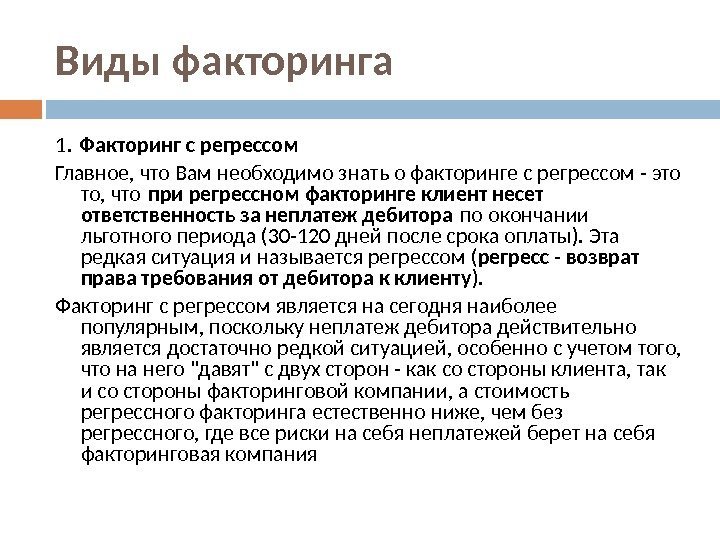 Виды факторинга 1. Факторинг с регрессом Главное, что Вам необходимо знать о факторинге с регрессом — это то, что при регрессном факторинге клиент несет ответственность за неплатеж дебитора по окончании льготного периода (30 -120 дней после срока оплаты). Эта редкая ситуация и называется регрессом ( регресс — возврат права требования от дебитора к клиенту ). Факторинг с регрессом является на сегодня наиболее популярным, поскольку неплатеж дебитора действительно является достаточно редкой ситуацией, особенно с учетом того, что на него «давят» с двух сторон — как со стороны клиента, так и со стороны факторинговой компании, а стоимость регрессного факторинга естественно ниже, чем без регрессного, где все риски на себя неплатежей берет на себя факторинговая компания