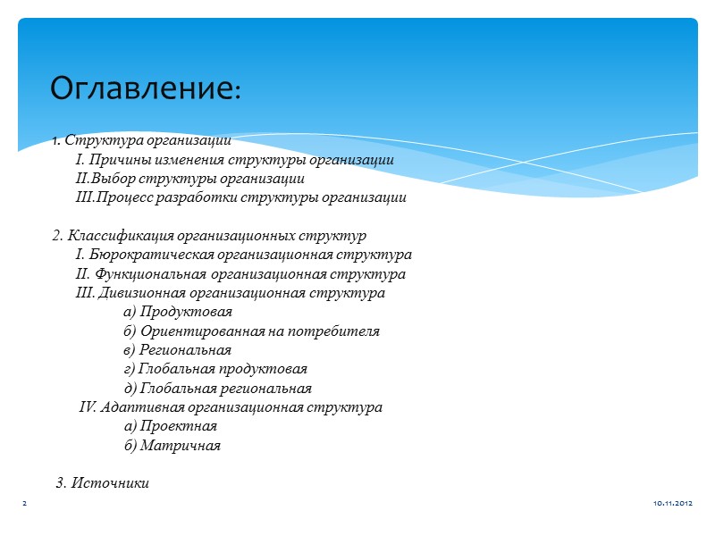 Оглавление: 1. Структура организации I. Причины изменения структуры организации II.Выбор структуры организации III.Процесс разработки структуры организации 2. Классификация организационных структур I. Бюрократическая организационная структура II. Функциональная организационная структура III. Дивизионная организационная структура а) Продуктовая б) Ориентированная на потребителя в) Региональная г) Глобальная продуктовая д) Глобальная региональная IV. Адаптивная организационная структура а) Проектная б) Матричная 3. Источники 10.11.2012 2