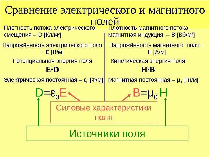 Сравнение электрического и магнитного полей Плотность потока электрического смещения – D [ Кл / м 2 ] Плотность магнитного потока, магнитная индукция – В [ Вб / м 2 ] Электрическая постоянная – ε 0 [ Ф / м ] Магнитная постоянная – μ 0 [ Гн / м ]Напряжённость электрического поля – Е [ В / м ] Напряжённость магнитного поля – Н [ А / м ] D = ε 0 E B = μ 0 H Источники поля. Силовые характеристики поля. Потенциальная энергия поля Е∙ D Кинетическая энергия поля Н∙В