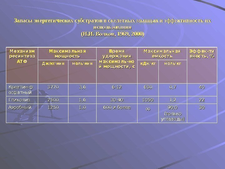 Запасы энергетических субстратов в скелетных мышцах и эффективность их использования (Н. И. Волков, 1969, 2000) Механизм ресинтеза АТФАТФ Максимальная мощность Время удержания максималь-но й мощности, с Максимальная емкость Эффек-ти вность, % Дж/кг/мин моль/мин к. Дж/кг моль/кг Креатин-ф осфатный 3770 3, 6 6 -12 630630 0, 7 4040 Гликолиз 2500 1, 6 30 -90 1050 1, 2 2222 Аэробный 1250 1, 0 600 и более ∞∞ 90, 0 (только углеводы)