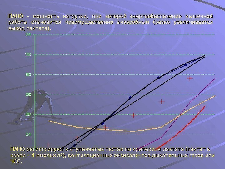 ПАНО – мощность нагрузки, при которой энергообеспечение мышечной работы становится преимущественно анаэробным (резко увеличивается выход лактата). ПАНО регистрируют в ступенчатых тестах по критериям лактата (лактат в крови – 4 ммоль ×× лл -1 -1 ), вентиляционных эквивалентов дыхательных газов или ЧСС.