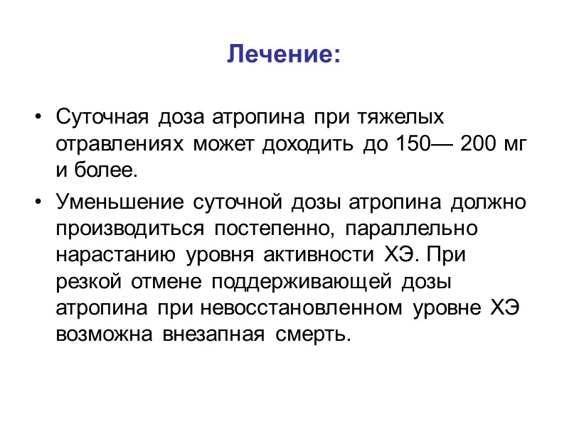 Лечение: Суточная доза атропина при тяжелых отравлениях может доходить до 150— 200 мг и более. Уменьшение суточной дозы атропина должно производиться постепенно, параллельно нарастанию уровня активности ХЭ. При резкой отмене поддерживающей дозы атропина при невосстановленном уровне ХЭ возможна внезапная смерть.