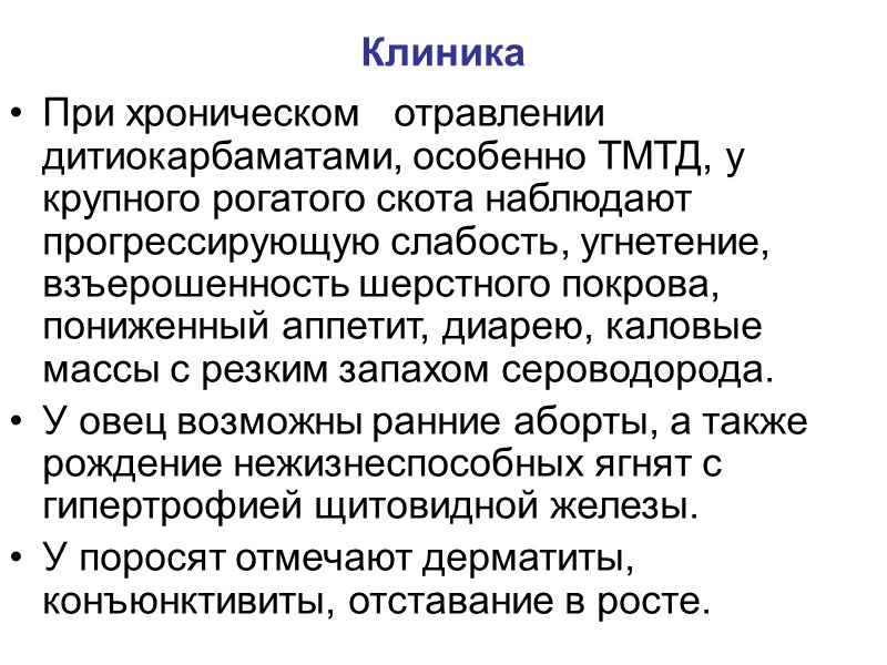Клиника При хроническом отравлении дитиокарбаматами, особенно ТМТД, у крупного рогатого скота наблюдают прогрессирующую слабость, угнетение, взъерошенность шерстного покрова, пониженный аппетит, диарею, каловые массы с резким запахом сероводорода. У овец возможны ранние аборты, а также рождение нежизнеспособных ягнят с гипертрофией щитовидной железы. У поросят отмечают дерматиты, конъюнктивиты, отставание в росте.