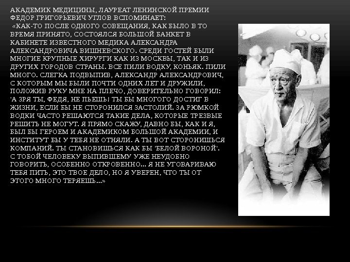АКАДЕМИК МЕДИЦИНЫ, ЛАУРЕАТ ЛЕНИНСКОЙ ПРЕМИИ ФЕДОР ГРИГОРЬЕВИЧ УГЛОВ ВСПОМИНАЕТ: «КАК-ТО ПОСЛЕ ОДНОГО СОВЕЩАНИЯ, КАК БЫЛО В ТО ВРЕМЯ ПРИНЯТО, СОСТОЯЛСЯ БОЛЬШОЙ БАНКЕТ В КАБИНЕТЕ ИЗВЕСТНОГО МЕДИКА АЛЕКСАНДРОВИЧА ВИШНЕВСКОГО. СРЕДИ ГОСТЕЙ БЫЛИ МНОГИЕ КРУПНЫЕ ХИРУРГИ КАК ИЗ МОСКВЫ, ТАК И ИЗ ДРУГИХ ГОРОДОВ СТРАНЫ. ВСЕ ПИЛИ ВОДКУ, КОНЬЯК. ПИЛИ МНОГО. СЛЕГКА ПОДВЫПИВ, АЛЕКСАНДРОВИЧ, С КОТОРЫМ МЫ БЫЛИ ПОЧТИ ОДНИХ ЛЕТ И ДРУЖИЛИ, ПОЛОЖИВ РУКУ МНЕ НА ПЛЕЧО, ДОВЕРИТЕЛЬНО ГОВОРИЛ: ‘А ЗРЯ ТЫ, ФЕДЯ, НЕ ПЬЕШЬ! ТЫ БЫ МНОГОГО ДОСТИГ В ЖИЗНИ, ЕСЛИ БЫ НЕ СТОРОНИЛСЯ ЗАСТОЛИЙ. ЗА РЮМКОЙ ВОДКИ ЧАСТО РЕШАЮТСЯ ТАКИЕ ДЕЛА, КОТОРЫЕ ТРЕЗВЫЕ РЕШИТЬ НЕ МОГУТ. Я ПРЯМО СКАЖУ, ДАВНО БЫ, КАК И Я, БЫЛ БЫ ГЕРОЕМ И АКАДЕМИКОМ БОЛЬШОЙ АКАДЕМИИ, И ИНСТИТУТ БЫ У ТЕБЯ НЕ ОТНЯЛИ. А ТЫ ВОТ СТОРОНИШЬСЯ КОМПАНИЙ. ТЫ СТАНОВИШЬСЯ КАК БЫ ‘БЕЛОЙ ВОРОНОЙ’. С ТОБОЙ ЧЕЛОВЕКУ ВЫПИВШЕМУ УЖЕ НЕУДОБНО ГОВОРИТЬ, ОСОБЕННО ОТКРОВЕННО. . . Я НЕ УГОВАРИВАЮ ТЕБЯ ПИТЬ, ЭТО ТВОЕ ДЕЛО, НО Я УВЕРЕН, ЧТО ТЫ ОТ ЭТОГО МНОГО ТЕРЯЕШЬ. . . »