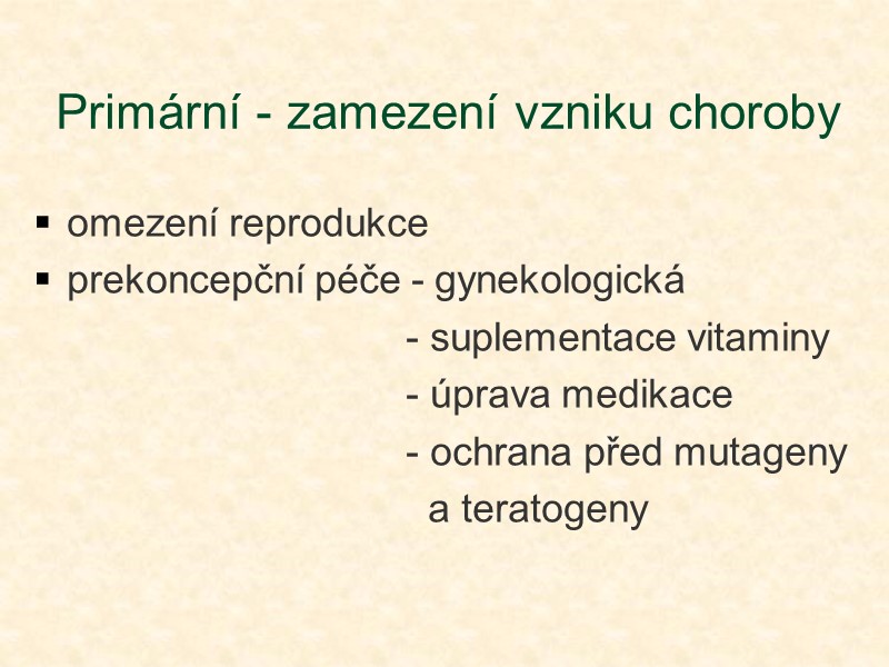Primární - zamezení vzniku choroby omezení reprodukce prekoncepční péče - gynekologická - suplementace vitaminy - úprava medikace - ochrana před mutageny a teratogeny