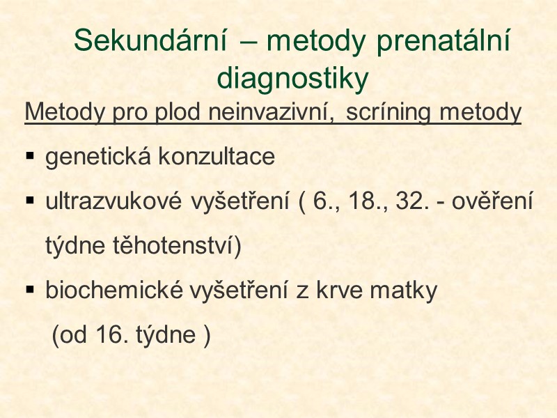Metody pro plod neinvazivní, scríning metody genetická konzultace ultrazvukové vyšetření ( 6., 18., 32. - ověření týdne těhotenství) biochemické vyšetření z krve matky (od 16. týdne ) Sekundární – metody prenatální diagnostiky