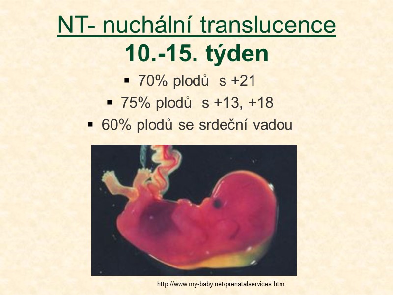 NT- nuchální translucence 10.-15. týden 70% plodů s +21 75% plodů s +13, +18 60% plodů se srdeční vadou http://www.my-baby.net/prenatalservices.htm