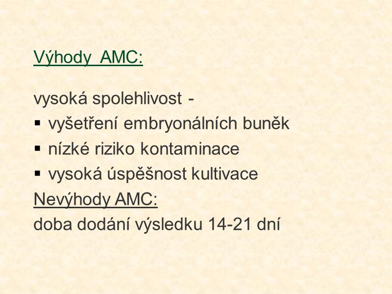 Výhody AMC: vysoká spolehlivost - vyšetření embryonálních buněk nízké riziko kontaminace vysoká úspěšnost kultivace Nevýhody AMC: doba dodání výsledku 14-21 dní