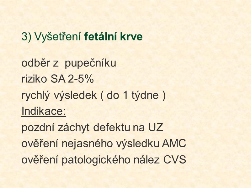 3) Vyšetření fetální krve odběr z pupečníku riziko SA 2-5% rychlý výsledek ( do 1 týdne ) Indikace: pozdní záchyt defektu na UZ ověření nejasného výsledku AMC ověření patologického nález CVS