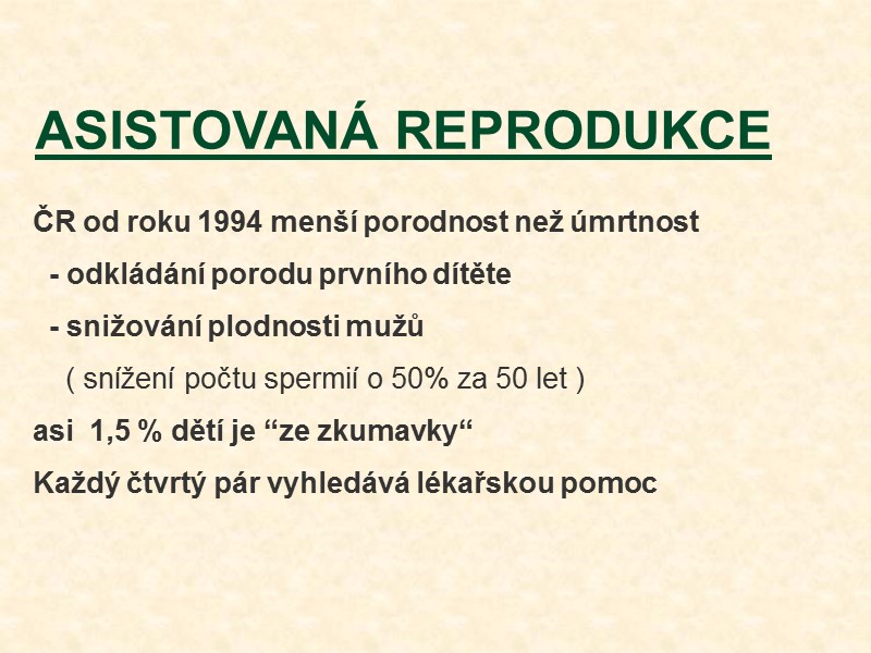 ASISTOVANÁ REPRODUKCE ČR od roku 1994 menší porodnost než úmrtnost - odkládání porodu prvního dítěte - snižování plodnosti mužů ( snížení počtu spermií o 50% za 50 let ) asi 1,5 % dětí je “ze zkumavky“ Každý čtvrtý pár vyhledává lékařskou pomoc
