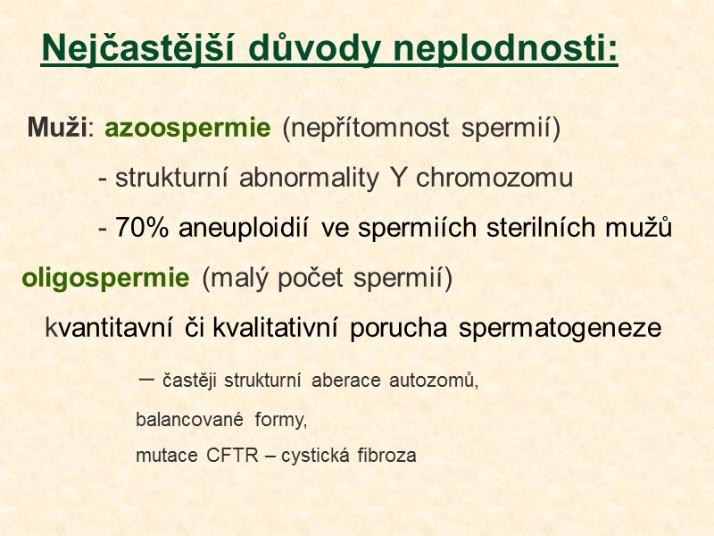 Nejčastější důvody neplodnosti: Muži: azoospermie (nepřítomnost spermií) - strukturní abnormality Y chromozomu - 70% aneuploidií ve spermiích sterilních mužů oligospermie (malý počet spermií) kvantitavní či kvalitativní porucha spermatogeneze – častěji strukturní aberace autozomů, balancované formy, mutace CFTR – cystická fibroza
