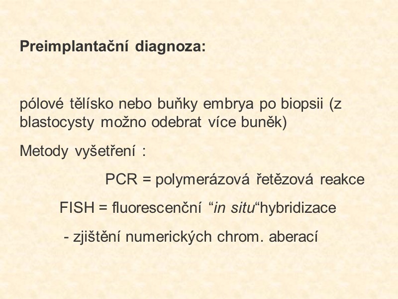 Preimplantační diagnoza: pólové tělísko nebo buňky embrya po biopsii (z blastocysty možno odebrat více buněk) Metody vyšetření : PCR = polymerázová řetězová reakce FISH = fluorescenční “in situ“hybridizace - zjištění numerických chrom. aberací