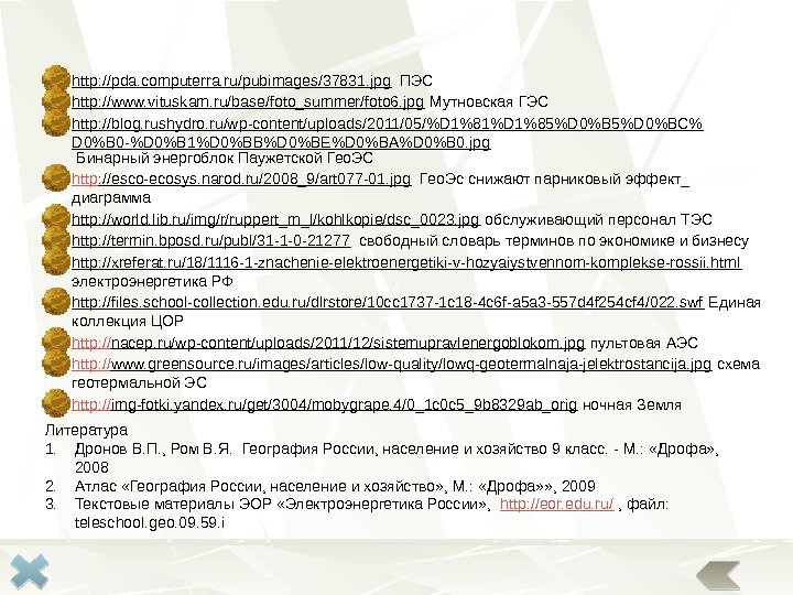 http : //blegs. free. fr/nouveau%20 site/2108 i. jpg ВАЗ http : //auto. webalta. ru/img/gallery/kamaz/5410/kamaz-5410 -5. jpg Камаз http : //uazscout. ru/uploads/images/UAZ_469_foto_2. jpg ульяновский вездеход http : //tf 1. mosfont. ru/photo/01/75/64/175643. jpg Энгельс, троллейбус http : //transport. saratov. gov. ru/upload/iblock/f 3 d/1. jpg автобусы http : //sdelanounas. ru/images/img/tabitum. ru/partners_snpz. jpg Саратовский НПЗ http : //corporate. lanxess. com/uploads/tx_lxsmatrix/2009 -00040_03. jpg каучук http : //dynamicchina. cn/Upload/Pic. Files/200812301557494299. jpg полиэтилен http : //md. all. biz/img/md/catalog/19993. jpeg полиэтиленовые трубы http : //uni-car 1. ru/netcat_files/81/79/d 750212 a 2 d 106 b 010219 b 4 ff 4144 bd 48 крышка полиэтиленовая http: //www. sergiev. ru/media/imagecache/652 px/images/3416/DSC 00084. JPG река http: //www. newsboy. ru/uploads/posts/2010 -08/1283237414_neft. jpg руки с нефтью http: //www. pro-volgograd. ru/contents/modules/_getimgpreview 3. php? f=ges. jpg&w=620&h=0&t = Волжская ГЭС http: //mariuver. files. wordpress. com/2009/01/erzianj_avat. jpg костюм мордвы http: //im 8 -tub-ru. yandex. net/i? id=293509208 -42 -72 Астраханский заповедник http: //i 1. i. ua/prikol/pic/0/4/433840_417586. jpg кристалл соли http: //www. sergiev. ru/media/imagecache/652 px/images/3416/DSC 00084. JPG река http: //photos. streamphoto. ru/0/a/a/c 4 b 041 be 9208 fce 4 adf 74 b 50321 ebaa 0. jpg долина Волги, пейзаж около Саратова http: //dic. academic. ru/pictures/wiki/files/50/275 px-Water_caltrop_on_lake. JPG заросли чилима http: //macroclub. ru/gallery/data/500/2204. jpg рдест http: //www. tumentoday. ru/wp-content/uploads/2010/10/196 -12 -1. jpg белый журавль http: //www. zooeco. com/Im 2/Pelecanus%20 crispus 1. jpg кудрявый пеликан http: //www. yage. org/lotos/3. jpg лотос http: //www. sergiev. ru/media/imagecache/652 px/images/3416/DSC 00084. JPG река http: //photos. streamphoto. ru/0/a/a/c 4 b 041 be 9208 fce 4 adf 74 b 50321 ebaa 0. jpg долина Волги, пейзаж около Саратова http: //www. 79. mchs. gov. ru/upload/iblock/3955 deda 523 f 67 b 9 d 48 ae 474775 abc 58. jpg электропоезд http: //img-fotki. yandex. ru/get/5600/r 3067 at. 8/0_4 d 88 e_14 cb 562 e_XL речное судно http: //lentaregion. ru/wp-content/uploads/2011/02/1290875861_montazh_magistr_truboprovodov_8. jpg трубопровод http: //s 13. radikal. ru/i 186/1001/d 5/67 ed 144 ee 0 b 0. jpg автомобиль http: //www. hotelleparadis. com/wp-content/plugins/wp-o- самолет http: //vseref. ru/view-c 0030280. html Особенности и проблемы развития хозяйства Поволжья http: // www. vneuroka. ru/okrmir_gallery. php? cat=1&sub=3 полезные ископаемые http: // russia. rin. ru/pictures/6130. jpg Мамаев курган http: // s 4. images. drive 2. ru/user. blog. photos/x 1/4400/000/2 cc/52 b/88 cddd 4 eac 089203 -large. jpg Дом Павлова http: // www. volgrad. ru/uploads/photos/volgograd/412131. jpg речной вокзал Волгограда http: // volgorodok. ru/wp-content/gallery/footer/volgograd-photo 26. jpg вид с самолета на Волгоград http: // img. beta. rian. ru/images/18921/60/189216031. jpg пастбище http: // forexaw. com/TERMs/Nature/img 241013_5 -19_Pastbische. jpg пастбище http: // www. equestrian. ru/photos/user_photo/2009/637 c 9 d 0 b. jpg кони http: //images 02. olx. ru/ui/5/85/73/1269777312_84138273_1 —-. jpg сельхозугодия http: // www. yeisk. info/images/newsimg/psheniza. jpg зерно http: // www. povarenok. ru/images/all/349942. jpg томат http: // img-2007 -09. photosight. ru/11/2295707. jpg арбузы http: // www. greenmama. ru/dn_images/01/93/56/06/12218036961187727152_sz 6090003. jpg арбуз http: // upload. wikimedia. org/wikipedia/commons/thumb/f/f 2/Raketa_Samara. jpg/415 px-Raketa_Samara. jpg Монумент ракета-носитель «Союз» • Шапель Л. Н. Презентация «Восточно-Сибирский экономический район. • Интерактивное наглядное пособие. Поволжье. Физическая карта. Социально-экономическая карта. ООО «Дрофа» , 2006. • Литература • 1. Дронов В. П. , Ром В. Я. География России, население и хозяйство 9 класс. — М. : «Дрофа» , 2008 • 2. Атлас «География России, население и хозяйство» , М. : «Дрофа» » ,