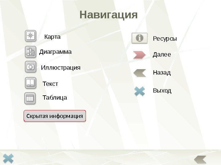 Карта Иллюстрация. Диаграмма Текст Скрытая информация Таблица Навигация Далее Назад Выход Ресурсы