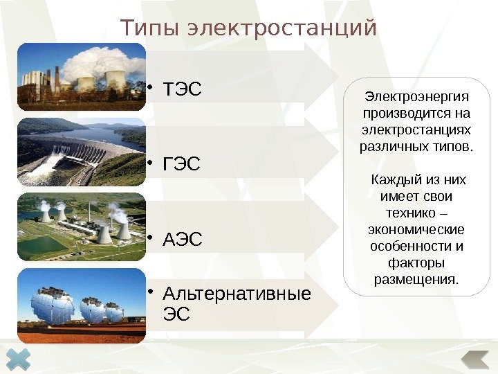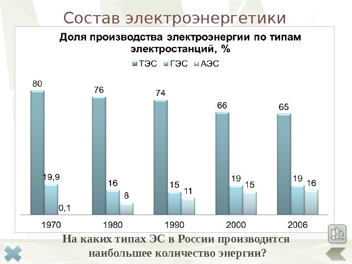 Астраханское месторождение. Топливно-энергетический комплекс Топливная Электроэнергетика НПЗ в крупных городах ГЭС Волжская, Саратовская, Нижнекамская, Волгоградская. ТЭС, дающие 3/5 электроэнергии, работают на местном сырье — мазуте и газе. Они, в основном, размещены в городах, где развита нефтепереработка и нефтехимия. Балаковская ТЭС Альметьевск (Татарстан) – начальный пункт многих нефтепроводов в т. ч. нефтепровода «Дружба» оз. Эльтон оз. Баскунчак ТЭК высокоразвит. Район полностью обеспечен собственным топливом, занимает 2 место в РФ после Западно-Сибирского экономического района по добыче нефти и газа. 10% общероссийского производства электроэнергии
