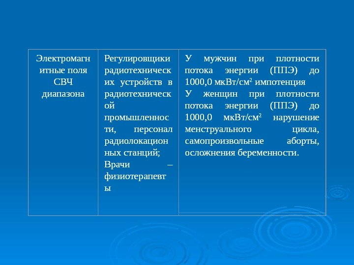 Электромагн итныеполя СВЧ диапазона Регулировщики радиотехническ их устройств в радиотехническ ой промышленнос ти, персонал радиолокацион ныхстанций; Врачи – физиотерапевт ы У мужчин при плотности потока энергии (ППЭ) до 1000, 0 мк. Вт/см 2 импотенция У женщин при плотности потока энергии (ППЭ) до 1000, 0 мк. Вт/см 2 нарушение менструального цикла, самопроизвольные аборты, осложнениябеременности.