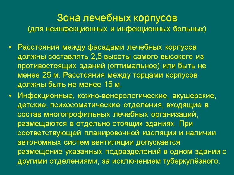 Зона лечебных корпусов (для неинфекционных и инфекционных больных) Расстояния между фасадами лечебных корпусов должны составлять 2,5 высоты самого высокого из противостоящих зданий (оптимальное) или быть не менее 25 м. Расстояния между торцами корпусов должны быть не менее 15 м. Инфекционные, кожно-венерологические, акушерские, детские, психосоматические отделения, входящие в состав многопрофильных лечебных организаций, размещаются в отдельно стоящих зданиях. При соответствующей планировочной изоляции и наличии автономных систем вентиляции допускается размещение указанных подразделений в одном здании с другими отделениями, за исключением туберкулёзного.