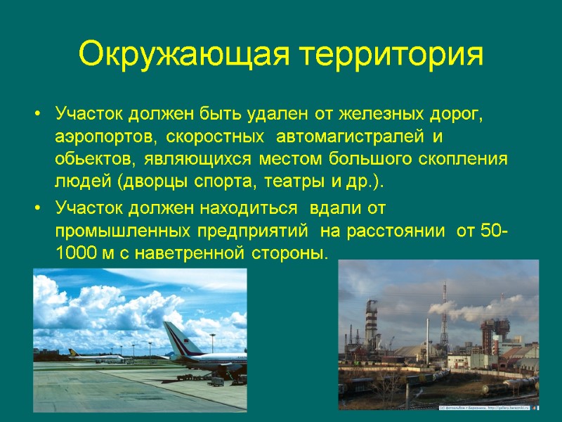 Окружающая территория Участок должен быть удален от железных дорог, аэропортов, скоростных автомагистралей и обьектов, являющихся местом большого скопления людей (дворцы спорта, театры и др.). Участок должен находиться вдали от промышленных предприятий на расстоянии от 50- 1000 м с наветренной стороны.
