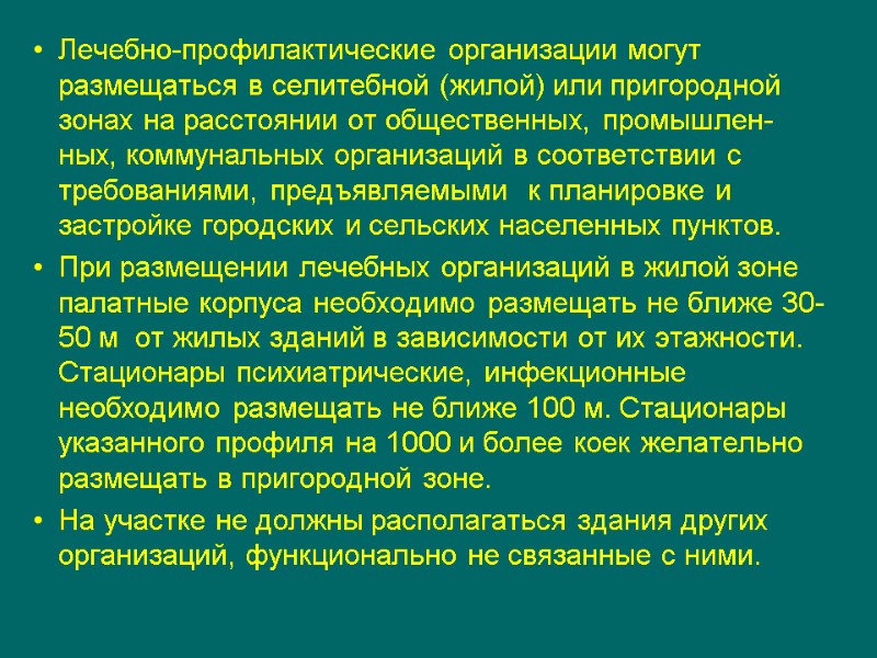 Лечебно-профилактические организации могут размещаться в селитебной (жилой) или пригородной зонах на расстоянии от общественных, промышлен- ных, коммунальных организаций в соответствии с требованиями, предъявляемыми к планировке и застройке городских и сельских населенных пунктов. При размещении лечебных организаций в жилой зоне палатные корпуса необходимо размещать не ближе 30-50 м от жилых зданий в зависимости от их этажности. Стационары психиатрические, инфекционные необходимо размещать не ближе 100 м. Стационары указанного профиля на 1000 и более коек желательно размещать в пригородной зоне. На участке не должны располагаться здания других организаций, функционально не связанные с ними.