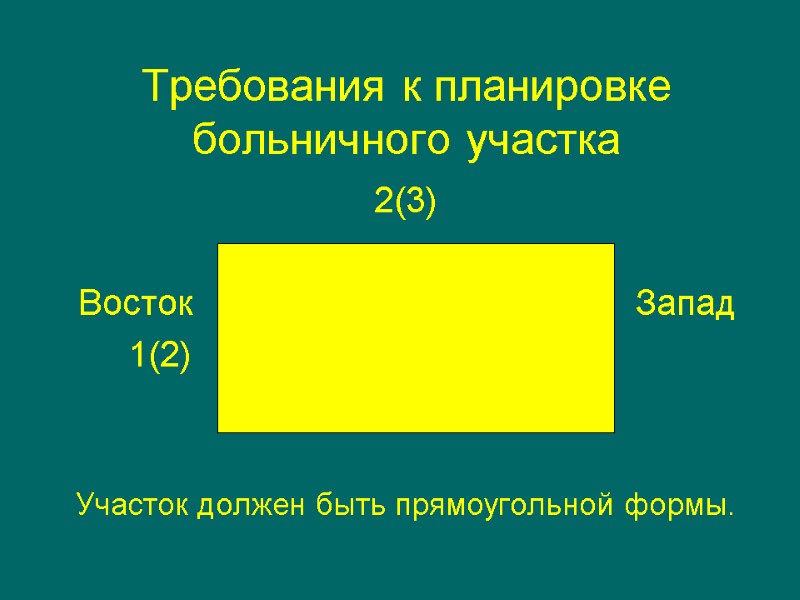 Требования к планировке больничного участка 2(3) Восток Запад 1(2) Участок должен быть прямоугольной формы.