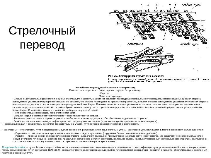 Стрелочный перевод Устройство «французской» стрелки (с остряками). Рамные рельсы (рельсы с боков стрелки, идущие без разрывов). Стрелка: Механизм перевода. — Стрелочный указатель. Применяется в ручных стрелках для указания, в каком направлении переведена стрелка, бывают освещаемые и неосвещаемые; белая сторона освещаемого указателя или ребро неосвещаемого означает, что стрелка переведена по прямому направлению, а жёлтая сторона освещаемого указателя или боковая сторона неосвещаемого указывают на то, что стрелка переведена на боковой путь. В автоматических стрелках указатели не ставятся, направление, в котором переведена такая стрелка, определяется по положению остряков. Кроме, того по сигналу светофора можно определить, что одна или несколько стрелок в маршруте поезда установлены на боковой путь. В зависимости от этого машинист выбирает скоростной режим. — Тяги, соединяющие переводной механизм с остряками. — Остряки (перья в трамвайной терминологии) — подвижные участки рельсов. — Корневые стыки — стыки в корнях остряков. Их гайки не затягивают до упора, чтобы обеспечить подвижность остряков. — Замки Мелентьева, позволяющие зафиксировать стрелку в одном положении (в настоящее время практически не используются). — Переводная кривая и соединительная прямая (соединительные участки пути, которые соединяют остряки с крестовиной). — Крестовины — это элементы пути, предназначенные для пересечения рельсовых нитей под некоторым углом. Крестовина устанавливается в месте пересечения рельсовых нитей: — Сердечник — основная деталь крестовины, выполненная в виде треугольника (сердечники бывают подвижные и неподвижные). — Усовики — предназначены для обеспечения правильного направления колеса при проходе через «мертвую зону» (пространство, гле сердечник уже закончился, а рельс -соединительного пути еще не начался). При правильной регулировке деталей крестовины колёса не должны касаться усовиков или контррельсов (контррельсы расположены с противоположных сторон у внешних рельсов стрелочного перевода напротив крестовины). Предельный столбик — путевой знак в виде столбика окрашенного в специальные сигнальные цвета в зависимости от классификации пути, устанавливаемый в месте, где расстояние между осями смежных путей составляет 4100 мм. Он определяет место, за которым размещенный на пути подвижной состав будет находится в габарите, обеспечивающем безопасный пропуск по соседнему пути.