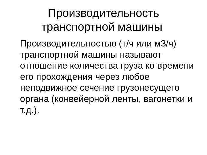 Производительность транспортной машины Производительностью (т/ч или м 3/ч) транспортной машины назы вают отношение количества груза ко времени его прохождения через любое неподвижное сечение грузонесущего органа (конвейерной ленты, вагонетки и т. д. ).