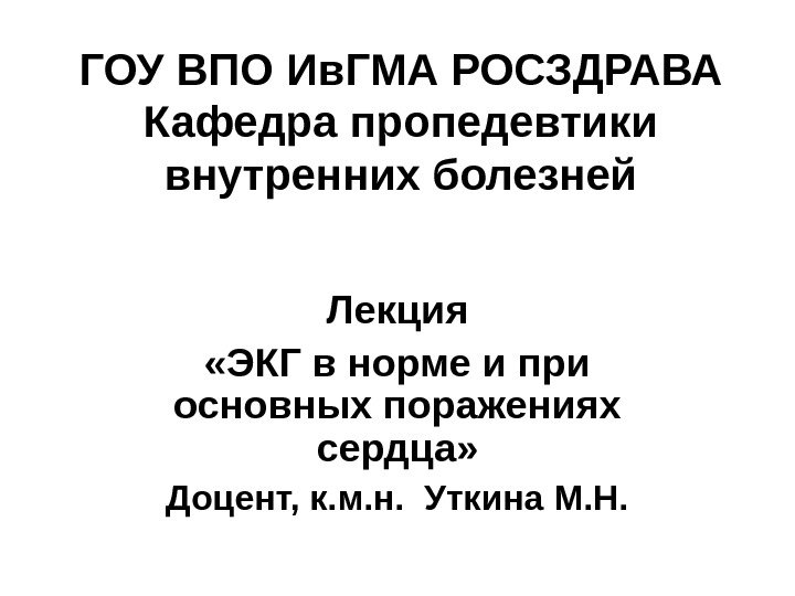 ГОУ ВПО Ив. ГМА РОСЗДРАВА Кафедра пропедевтики внутренних болезней Лекция «ЭКГ в норме и при основных поражениях сердца» Доцент, к. м. н. Уткина М. Н.