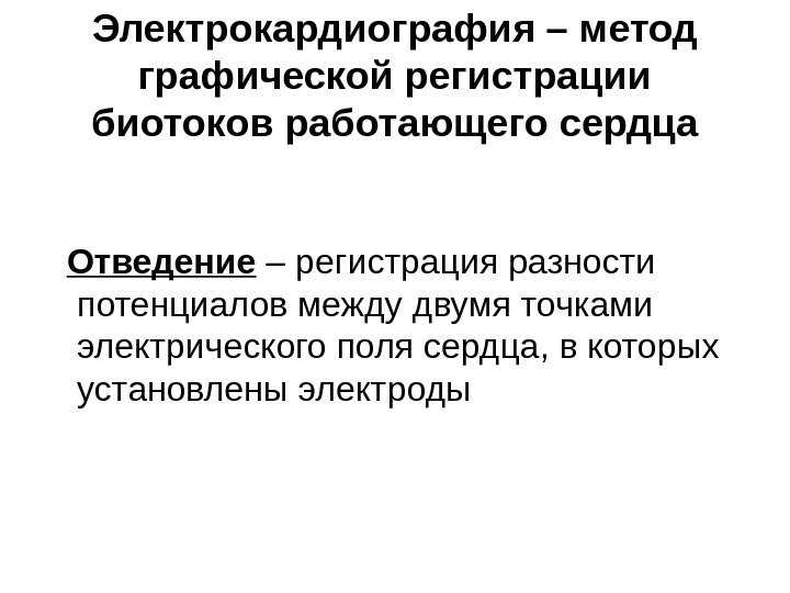 Электрокардиография – метод графической регистрации биотоков работающего сердца Отведение – регистрация разности потенциалов между двумя точками электрического поля сердца, в которых установлены электроды