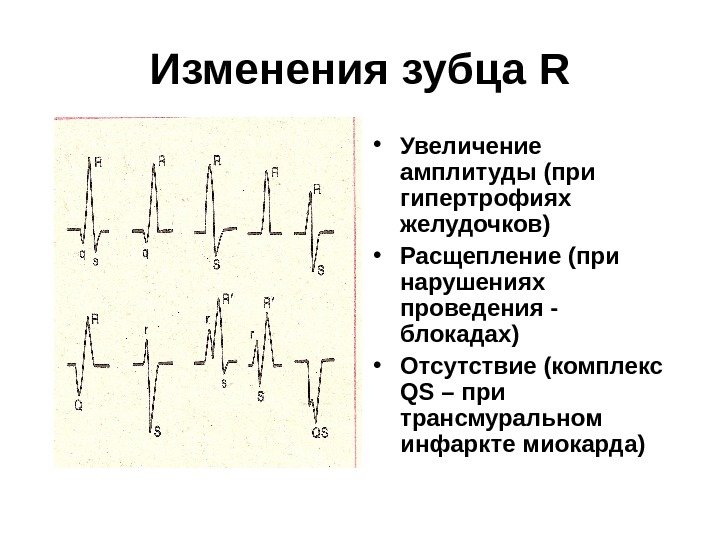 Изменения зубца R • Увеличение амплитуды (при гипертрофиях желудочков) • Расщепление (при нарушениях проведения — блокадах) • Отсутствие (комплекс QS – при трансмуральном инфаркте миокарда)