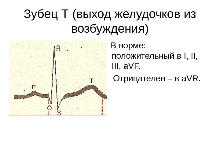 Зубец Т (выход желудочков из возбуждения) В норме: положительный в I, II, III, a. VF. Отрицателен – в a. VR.