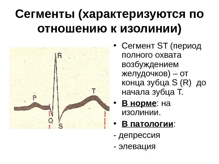 Сегменты (характеризуются по отношению к изолинии) • Сегмент ST (период полного охвата возбуждением желудочков) – от конца зубца S (R) до начала зубца Т. • В норме : на изолинии. • В патологии : — депрессия — элевация