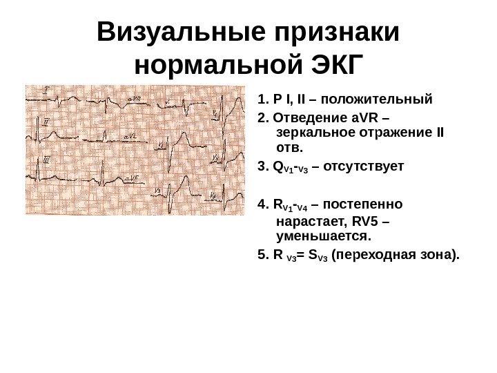 Визуальные признаки нормальной ЭКГ 1. Р I, II – положительный 2. Отведение a. VR – зеркальное отражение II отв. 3. Q V 1 — V 3 – отсутствует 4. R V 1 — V 4 – постепенно нарастает, RV 5 – уменьшается. 5. R V 3 = S V 3 ( переходная зона).
