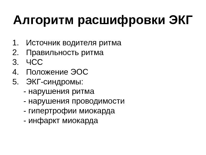 Алгоритм расшифровки ЭКГ 1. Источник водителя ритма 2. Правильность ритма 3. ЧСС 4. Положение ЭОС 5. ЭКГ-синдромы: — нарушения ритма — нарушения проводимости — гипертрофии миокарда — инфаркт миокарда