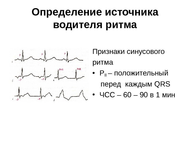 Определение источника водителя ритма Признаки синусового ритма • РII – положительный перед каждым QRS • ЧСС – 60 – 90 в 1 мин